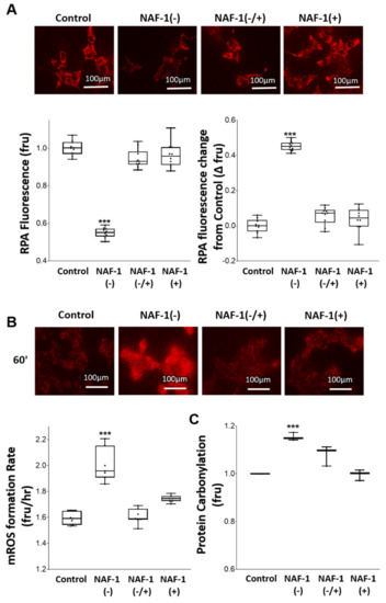 Mitochondrial labile iron (mLI), ROS (mROS), and protein carbonylation in INS-1E cells with repressed or overexpressed NAF-1 levels. (A) Representative epi-fluorescent images of mitochondrial RPA fluorescence (top), and quantification of mitochondrial RPA fluorescence (bottom graphs) in INS-1E cells with repressed or overexpressed NAF-1 level (left graph is for total RPA fluorescence and right graph is for change in RPA fluorescence from control). Quenching of RPA fluorescence indicates mitochondrial labile iron accumulation. (B) Representative epi-fluorescent images of mitochondrial mito-SOXTM fluorescence (top), and quantitative analysis (bottom, left), of mitochondrial mito-SOXTM fluorescence (indicating mitochondrial superoxide accumulation), in INS-1E cells with repressed or overexpressed NAF-1 level. (C) Cellular content of carbonylated proteins in the different INS-1E cell lines with repressed or overexpressed NAF-1 levels, measured with coumarin hydrazine (CH). The results are presented as box-and-whisker plots and include all data points measured from three different experiments. *** p < 0.001, compared to control; Student’s t-test, N = 450 for (A), N = 150 for (B), and N = 450 for (C).