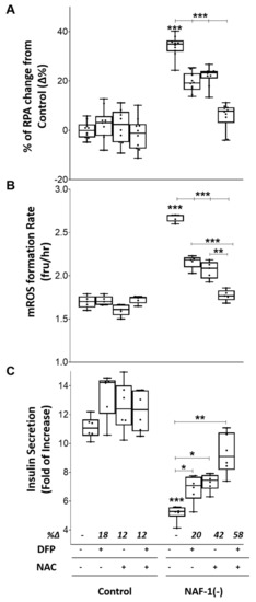 Pharmacological amelioration of enhanced mLI and mROS, and decrease insulin production in NAF-1(−) INS-1E cells with a combined treatment of DFP and NAC. (A) Mitochondrial labile iron levels in control and NAF-1(−) cells in the presence or absence of DFP (50 µM) and/or NAC (100 µM). (B) Same as in (A), but for mROS levels. (C) Fold change in glucose-stimulated insulin secretion of control and NAF-1(−) cells in the presence or absence of DFP and/or NAC. The results are shown as box-and-whisker plots and include all data points measured from three different experiments. * p < 0.05, ** p < 0.01, *** p < 0.001, compared to control; Student’s t-test, N = 450 for (A), N = 150 for (B), and N = 3 for (C). Abbreviations: DFP, deferiprone; NAC, N - acetyl cysteine.