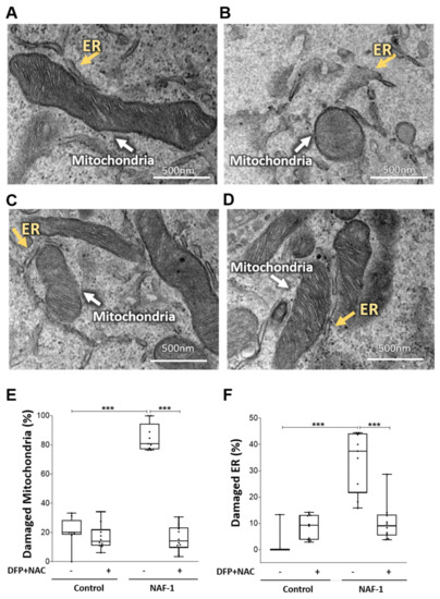 Pharmacological amelioration of mitochondrial and ER morphology in NAF-1(−) INS-1E cells with a combined DFP and NAC treatment. (A–D) Representative TEM images of control and NAF-1(−) INS-1E cells treated or untreated with a NAC (100 µM) + DFP (50 µM) combination (A, Control. (B) NAF-1(−). (C) Control treated with DFP+ NAC. (D) NAF-1(−) treated with DFP+ NAC). Yellow and white arrows indicate ER and mitochondria, respectively. (E,F) Statistical analysis of mitochondrial (E), or ER (F), damage in NAF-1(−) INS-1E cells following the combined DFP+ NAC treatment. The results are shown as box-and-whisker plots and include all data points measured from three different experiments. *** p < 0.001, compared to control; Student’s t-test, N = 200 for mitochondria, N = 300 for ER. Abbreviations: DFP, deferiprone; NAC, N-acetyl cysteine.
