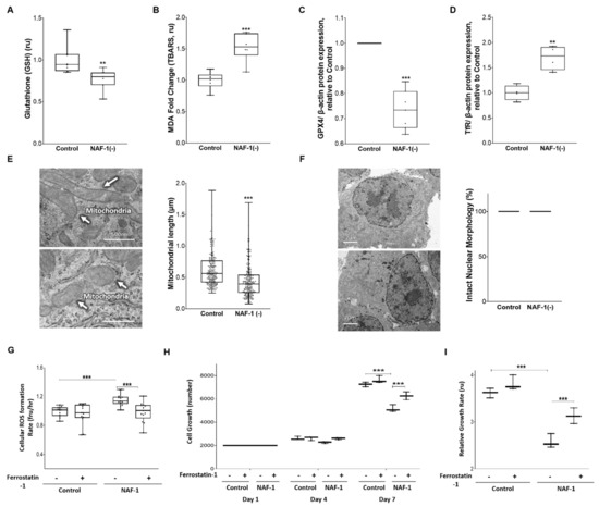 Presence of ferroptosis-like symptoms in NAF-1(−) pancreatic cells. Reduced glutathione (GSH) levels (A), increased lipid peroxidation (B), decreased GPX4 expression (C), enhanced TfR expression (D), and shortened mitochondria (E) (representative image: top, control; bottom, NAF-1-deficient) in control and NAF-1(−) pancreatic cells. (F) Morphology of nuclei in control and NAF-1(−) cells (representative image: top, control; bottom, NAF-1-deficient). (G) Cellular ROS levels in control and NAF-1(−) cells in the presence or absence of 2 µM, ferrostatin-1. (H,I) cell growth of control and NAF-1(−) cells (measured by counting cell numbers (H) or using PrestoBlueTM (I)) in the presence or absence 2 µM ferrostatin-1. The results are shown as box-and-whisker plots and include all data points measured from three different experiments. ** p < 0.01, *** p < 0.001, compared to control; Student’s t-test, N = 3 for (A,B,G,H,I), N = 5 for (C,D), N = 250 for (E), N = 10 for (F). Abbreviations: GSH, reduced glutathione; MDA, malondialdehyde; GPX4, glutathione peroxidase 4; TfR, transferrin receptor.