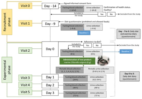 The test product was freeze-dried biomass of marine Chlorella vulgaris strain UTEX 580 (belonging to the culture collection of algae at the University of Texas at Austin). Marine microalgae were produced by Buggypower (Portugal), Lda, using a patent-protected technology. Briefly, Chlorella vulgaris was grown in filtered seawater in controlled outdoor closed photobioreactors (proprietary process) under photoautotrophic conditions. The marine microalga Chlorella vulgaris was encapsulated in vegetarian hard capsules (YourSupplements, Stockport, UK), made from pullulan, a natural water-soluble polysaccharide in a sterile atmosphere. Each capsule contained 600 mg of dried microalgae. A dose of 6 g (10 capsules) corresponded to the following composition in carotenoids, PUFA and mineral salts: lutein-7.08 mg, β-carotene-1.88 mg, zeaxanthin-1.47 mg; linoleic acid-64.8 mg, α-linolenic acid-87.0 mg, EPA-3.30 mg, DHA-2.88 mg, Se-0.3 µg, I-79.2 µg. The nutritional content of the test product is presented in Table S1 (Supplementary Materials).