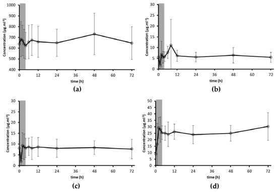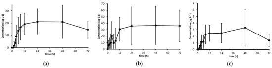 Data analysis of plasma concentrations of PUFA, namely, linoleic acid, α-linolenic acid, EPA and DHA, was also performed over the 72 h of the study (Figure 3). It is important to mention that despite all the volunteers following the list of prohibited and allowed foods, the intake of target PUFA after the first meal was already higher than the dose provided by the 6 g of Chlorella vulgaris. Therefore, only the plasma concentration values recorded in the first 4 h were related to the microalga intake. Our results showed that the main increases were observed for the linoleic acid and DHA, indicating that a single dose of marine Chlorella vulgaris (6 g) may increase the plasma concentrations of these PUFA after the first 4 h of microalga intake. Up to date, there are no studies reporting the bioavailability of PUFA from microalgae, including Chlorella species, in humans. The majority of the bioavailability studies were performed with fish oils where the tested doses of EPA and DHA were higher (up to 500 times) [] than the amounts reported herein for the marine microalga. In that study, the Cmax of EPA and DHA were achieved at 2.6 h, which are within the range of values observed in our work (Figure 3).