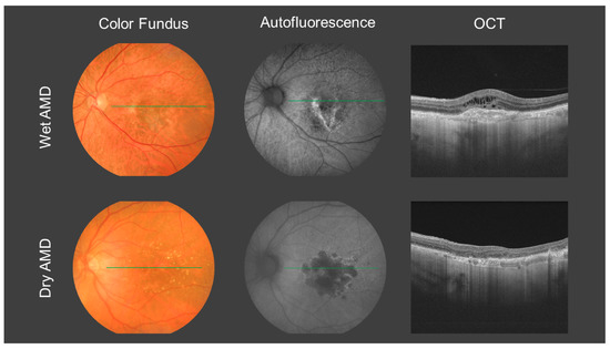 Representative retinographies and optical coherence tomography (OCT) of and eye with wet AMD and an eye with dry AMD. (Top row): Color fundus retinography, autofluorescence and OCT of the left eye of a patient presenting wet AMD. In retinography, choroidal neovascularization (CNV) can be seen as a grayish region covering the central macular area. Autofluorescece imaging shows a mixed pattern of hyperautofluorescence and hypoautofluorescence. On OCT the CNV can be clearly visualized as a hyperreflective layer under the retina with intraretinal fluid visualized as multiple hyporeflective spaces. (Bottom row): Color fundus retinography, autofluorescence, and OCT of the left eye of a patient presenting advanced dry AMD. In the retinography an area of central atrophy can be observed in the central macular area that allows better visualization of the choroidal vessels and is surrounded by multiple drusen. Autofluorescence clearly distinguishes the borders of the geographic atrophy due to hypoautofluorescence secondary to the retinal pigment epithelium (RPE) atrophy. OCT reveals atrophy of the RPE and outer retinal layers, with increased signal in the choroid and sclera. The green line represents the OCT section location.