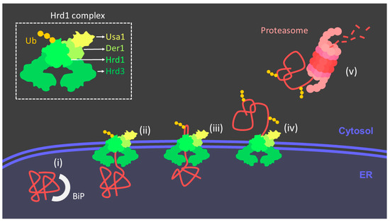 Recognition, retro-translocation, polyubiquitination, and proteasomal degradation of soluble ERAD Substrates. (i) Recognition of misfolded proteins by the ER-resident chaperones like BiP targeting them for retro-translocation. (ii) Initiation of retro-translocation crossing the Hrd1 complex, constituted by several subunits such as Hrd1, Hrd3, Der1, and Usa1; other subunits are not represented. (iii) The catalytic domain of Hrd1 polyubiquitinates the emerging protein in the cytosol. (iv) Further retro-translocation and polyubiquitination aided by cytoplasmic ubiquitin-binding protein complexes (not shown). (v) Proteasome degradation where the protein is broken down into peptide fragments.