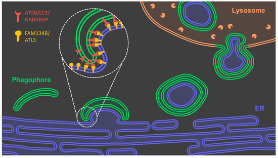 Together with the proteasome, macroautophagy is a main pathway for the degradation of intracellular elements [46]. Reticulophagy is the selective clearance and degradation of the ER components and membranes by encapsulation of fragments of the ER in forming autophagosomes (Figure 4). In order for specific fragments of the ER to be sequestered within autophagosomes there must be a recognition mechanism between the two structures. The membrane of the stressed ER triggers the recruitment of adaptor proteins such as FAM134B and ATL3 that have LC3-interacting regions, which can interact with nascent autophagosome membrane proteins such as ATG8, LC3 or GABARAP [38]. Then the autophagosome expands around the ER fragment that need to be removed and fuse with lysosomes wherein degradation of ER components takes place.
