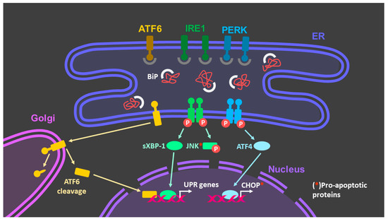 The UPR is triggered by the combined action of three conserved ER transmembrane stress sensors: activating transcription factor 6α (ATF6), PKR-like ER kinase (PERK), and inositol-requiring enzyme 1α (IRE1α) [47] (Figure 5). Under homeostatic conditions, these three proteins are inactive due to association with BiP. However, as we have explained, BiP has a high affinity for misfolded proteins and is therefore in an equilibrium between binding to these sensor proteins and to misfolded proteins. If the misfolded proteins begin to accumulate in the ER-lumen, BiP will dissociate from the ER stress sensors triggering the downstream signaling cascade [48].