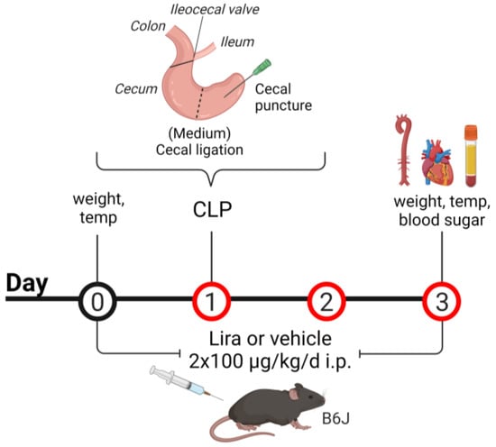 Three groups of mice were used: vehicle-treated and sham-operated controls (B6J), vehicle-treated septic mice induced by cecal ligation and puncture (CLP) and liraglutide-treated mice subjected to CLP (+Lira). Intraperitoneal injections of liraglutide (100 µ/kg) or saline (vehicle, adequate volume for B6J and CLP group) were started one day prior to the CLP procedure and continued until euthanasia, with an application twice daily every 12 h. A total of 48 h following sepsis induction by CLP, animals were sacrificed by cardiac puncture after anesthesia with ketamine/xylazine (120 mg/kg ketamine and 16 mg/kg xylazine in 0.9% NaCl). The heart, aorta and blood were harvested. Glucose levels were assessed in whole blood using the ACCU-CHEK sensor system from Roche Diagnostics GmbH (Basel, Schweiz). The mice were weighed before treatment and before euthanasia and their body temperature determined using an infrared thermometer for small rodents from Bioseb (Vitrolles, France) (Figure 1).