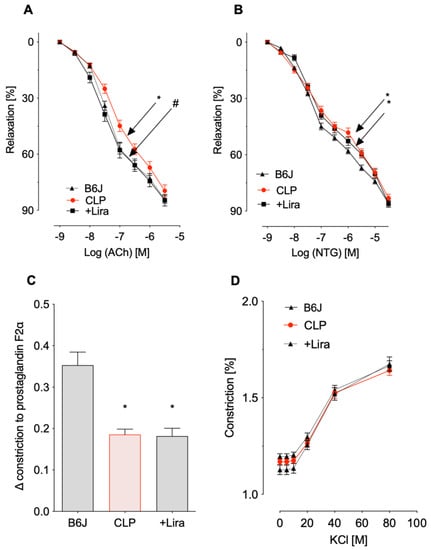 CLP negatively impacted both endothelium-dependent (ACh-response) and endothelium-independent (NTG-response) vasodilation. Additional treatment of septic mice with liraglutide (+Lira) significantly improved endothelial dysfunction caused by CLP whereas no significant protective effect on NTG-induced smooth muscle relaxation was shown (Figure 2A,B). Maximal constriction prompted by 2 μm prostaglandin F2α (PGF2α) was impaired in aortic rings from both vehicle- and liraglutide-treated CLP mice (Figure 2C). Vasoconstriction in response to depolarizing KCl was not changed by CLP or additional liraglutide administration compared to control mice (Figure 2D).