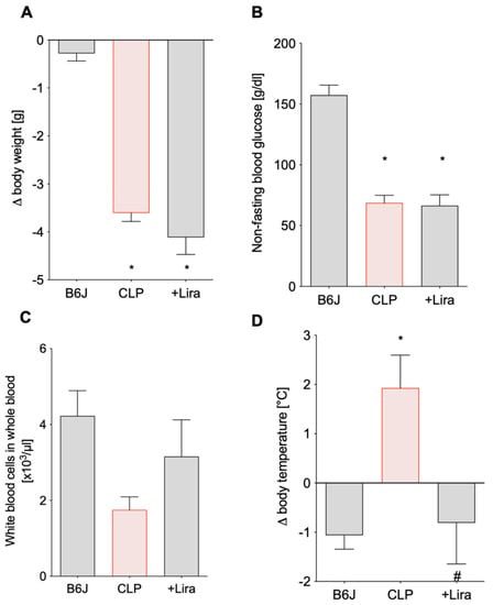 Treatment with the GLP-1 receptor agonist liraglutide protects against CLP-induced complications of leukopenia and hyperthermia without altering blood glucose levels in polymicrobial septic mice. (A,D) On day 0 and 3, animals were weighed and their temperature taken to determine Δ body weight and Δ body temperature, respectively. (B,C) Non-fasting blood glucose levels and white blood cell counts were evaluated in whole blood 2 days following sepsis induction. Data are the mean ± SEM of 22–26 (A), 19-22 (B) and 16-24 (D) measurements from individual animals or 6 individual blood samples (each pooled from 3 to 4 mice) (C). * p < 0.05 vs. B6J; # p < 0.05 vs. CLP.