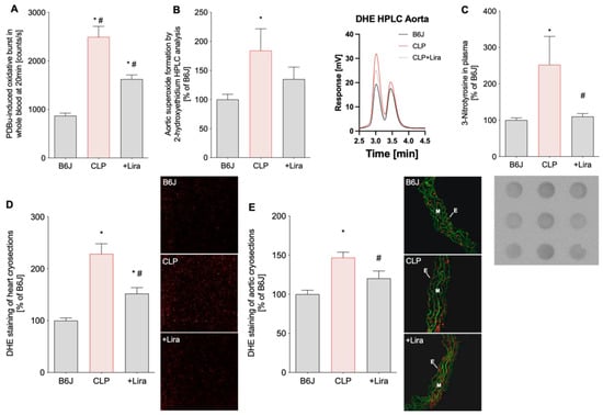 Blood oxidative burst and dihydroethidium (DHE)-staining of aortic and cardiac cryosections revealed significantly higher levels of ROS in the whole blood, heart and aorta of septic mice induced by CLP (Figure 4A,D,E). Superoxide-specific oxidation of DHE to 2-hydroxyethidium quantified by HPLC analysis confirmed elevated oxidative stress levels in vehicle-treated CLP-subjected mice (Figure 4B). Additionally, the marker of nitro-oxidative stress, 3-nitrotyrosine (3-NT), was increased in the plasma of CLP-mice (Figure 4C). Importantly, liraglutide treatment was able to significantly mitigate elevated oxidative stress levels of septic mice in all tissues (in the HPLC assay only by trend) and in plasma (Figure 4A–E).