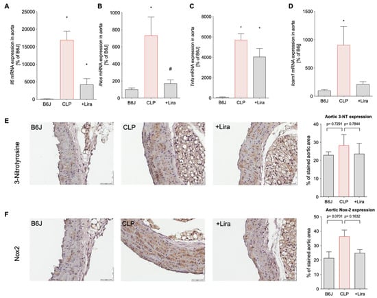 Treatment with the GLP-1 receptor agonist liraglutide suppresses CLP-induced vascular inflammation in polymicrobial septic mice. Aortic gene expression levels of (A) interleukin 6 (Il6), (B) inducible nitric oxide synthase (iNos), (C) tumor necrosis factor alpha (Tnfα) and (D) intercellular adhesion molecule-1 (Icam1) were measured by quantitative RT-PCR in aortic tissue. (E,F) Abundance of 3-NT-positive proteins and Nox2 protein expression in the aorta was determined by immunohistochemistry. Representative immunohistochemical images are shown next to the densitometric quantification. Magnification of 40× and scale bar of 50 μm. Data are the mean ± SEM of 3 individual samples (each pooled from 3 to 4 mice) (A–D) or 3 individual animals (E,F). * p < 0.05 vs. B6J; # p < 0.05 vs. CLP.
