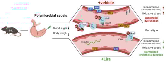 Here we show that the GLP-1 analog liraglutide improved vascular dysfunction, inflammation and oxidative stress in polymicrobial sepsis induced by cecal ligation and puncture (CLP) (Figure 6). CLP led to the loss of body weight and reduced blood glucose, whereas both parameters were not corrected by liraglutide treatment. As a surrogate parameter for a systemic inflammatory response, CLP animals demonstrated elevated body temperature and reduced white blood cell numbers in whole blood, all of which was normalized by liraglutide. Oxidative stress in whole blood and the vascular wall was significantly increased by peritoneal sepsis. Furthermore, induction of proinflammatory genes (Il6, Tnfα, Icam1 and iNos) and elevated expression the enzyme phagocytic NADPH oxidase (Nox2) and more pronounced oxidative nitration modifications of proteins (3-NT) were observed in septic mice. Importantly, all of these pro-oxidative and proinflammatory phenotypic changes induced by CLP were ameliorated by the application of the GLP-1 analog liraglutide.