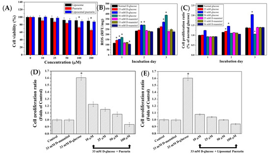 (A) Cell viability assay of empty liposome, puerarin extract and liposomal puerarin at various concentrations; (B) intracellular ROS of RMCs with respect to different glucose concentrations; (C) effects of glucose concentrations on proliferation of RMCs; (D,E) cytoprotective effect of puerarin extract and liposomal puerarin on RMCs in high glucose (33 mM). * p < 0.05. The ratios in Figure 5 (C–E) were calculated by normalizing with the control (RMCs in 5.6 mM of glucose).