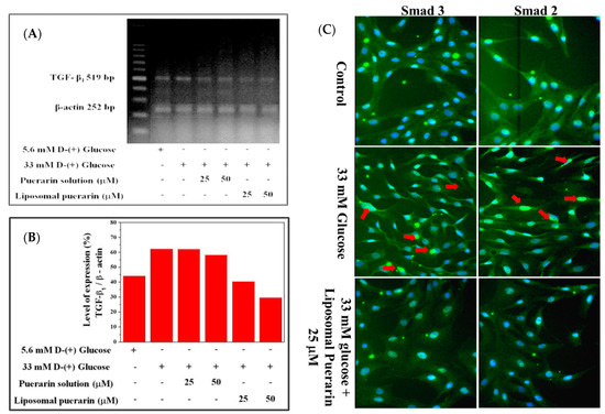 The effect of liposomal puerarin on TGF-β1 gene expression and the translocation of Smad 2/3 into the nucleus: (A) electrophorese of TGF-β1 gene extracted from RMCs; (B) quantitative expression of TGF-β1 gene; (C) fluorescence staining of Smad 2/3 of RMCs. Magnification: 400×. Control (1st row of Figure 6C): the nucleus of RMCs was stained with Hoechst 33258 (blue) and the cytoplasm was stained with antibodies of Smad 2/3 (green). When 33 mM of glucose were added, both Smad 2/3 proteins translocated in the nucleus, marked with red arrows (2nd row of Figure 6C). When 25 μM of liposomal Puerarin were used, the proteins were mainly found in cytoplasm (3rd row of Figure 6C).