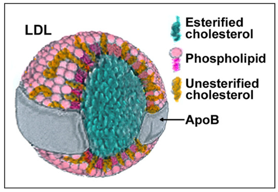 LDLs are composite molecules consisting of a hydrophobic core of polyunsaturated fatty acids and esterified cholesterol surrounded by phospholipids, unesterified cholesterol, and one molecule of apolipoprotein B-100 (apoB) (Figure 1). Based on physiochemical properties, LDLs can be classified into three or four subclasses, including large (LDL I), intermediate (LDL II), small (LDL III), and, in some studies, very small LDL (LDL IV), with the latter being able to easily penetrate the vascular wall and, therefore, be more prone to oxidation. All components of LDL can undergo oxidation [1], generating oxysterols, oxidized phospholipids, and end products of lipid peroxidation such as malondialdehyde (MDA) and 4-hydroxynonenal (HNE) that can be used as markers of LDL oxidation (reviewed in [8]). Adducts between ε-amino groups of lysine residues in apoB and reactive aldehydes such as MDA or HNE can also form, thereby reducing oxLDLs’ affinity for the LDL receptor and increasing their recognition by scavenger receptors [9]. When acting as signaling molecules in distant cells, these different types of oxLDLs may carry information on the severity of lesions and oxidative stress and trigger different responses.