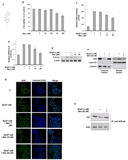 B(a)P activates AHR protein, which recognizes XRE, inducing the expression of the CYP1A1 gene. Therefore, we investigated the involvement of maclurin (Figure 1A) in B(a)P-induced signaling using the XRE-luciferase reporter assay, RT-PCR analysis, and Western blot analysis. As shown in Figure 1B, the B(a)P-induced XRE reporter activation was reduced by maclurin treatment in a concentration-dependent manner. The CYP1A1 mRNA and protein levels increased by B[a]P treatment were decreased by maclurin treatment (Figure 1C,D). In addition, maclurin treatment suppressed the nuclear translocation of AHR induced by B(a)P, as evidenced by Western blot analysis (Figure 1E) and immunocytochemistry assays (Figure 1F). Furthermore, in the immunoprecipitation experiment with anti-AHR antibodies to elucidate the possible action mechanism of maclurin in the nuclear translocation of AHR, while B(a)P induced the dissociation of AHR from the AHR-interacting protein (AIP) complex, maclurin treatment suppressed it (Figure 1G). These data indicate that maclurin attenuated the AHR signaling induced B[a]P by suppressing the dissociation of the AHR-AIP complex.