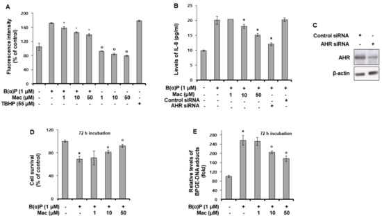 Maclurin attenuated intracellular production of ROS and IL-8, and reduced cell survival and BPDE-DNA adduct formation induced by B(a)P in HaCaT cells. (A) HaCaT cells were cultured with B(a)P and maclurin for 24 h, and the fluorescence intensity was analyzed. The data were verified by repeating independent experiment three times and the values represent the mean ± SD. * p < 0.05 vs. B(a)P treatment group, o p< 0.05 vs. untreated control. (B,C) HaCaT cells were transfected with AHR siRNA using the DharmaFECT® Duo transfection reagent. After 24 h incubation, the cells were incubated with maclurin (1, 10, 50 μM) and B(a)P (1 μM) for 24 h and then analyzed by ELISA for IL-8 (B) and Western blotting for AHR (C). All results were confirmed from at least three independent experiments and the values represent the mean ± SD. * p < 0.05 vs. B(a)P treatment group. (D,E) HaCaT cells were treated with maclurin (1, 10, 50 μM) and B(a)P (1 μM) for 72 h, and the cell survival assay (D) and BPDE-DNA adduct formation analysis (E) were performed. The data are expressed as the mean ± S.D. * p < 0.05 vs. untreated control, o p < 0.05 vs. B(a)P-treated control. The data were confirmed from at least three independent experiments. TBHP: Tert-butyl hydroperoxide, Mac: maclurin.