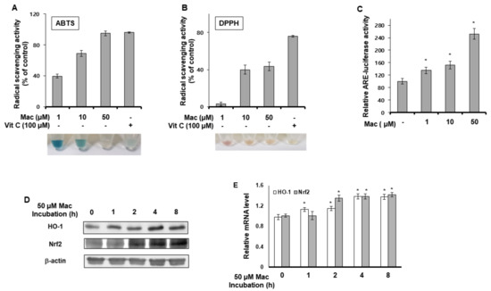 Maclurin showed radical scavenging property and activated ARE signaling. (A,B) ABTS (A) and DPPH (B) radical scavenging activity of maclurin. The results are shown as the mean ± SD of three replicates. (C) HaCaT cells were firstly transfected with the ARE-Luc reporter and a Renilla-luciferase vector using the DharmaFECT® Duo transfection reagent. After incubation for 24 h, the cells were treated with maclurin for 14 h. The cells were lysed and subjected to the luciferase reporter assay. The data are shown as the mean ± SD of three replicates. * p < 0.05 vs. untreated control. (D,E) HaCaT cells were incubated with maclurin for the indicated time (1–8 h). The cells were harvested and subjected to Western blots and RT-PCR for HO-1 and Nrf2. The data are shown as the mean ± SD of three replicates. * p < 0.05 vs. untreated control. Vit C: vitamin C, Mac: maclurin.
