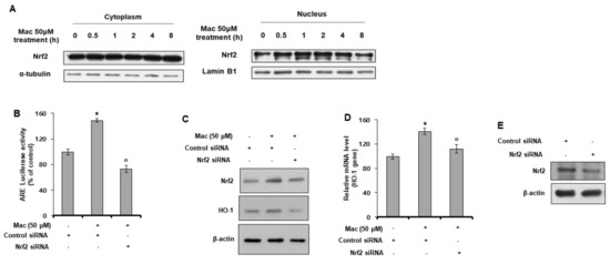 Maclurin induced nuclear translocation of Nrf2 and activated Nrf2-dependent ARE signaling. (A) HaCaT cells were treated with maclurin for 24 h and analyzed by Western blots of the cytosolic and nuclear fractions to assess Nrf2 translocation. (B) HaCaT cells were transfected with the ARE-Luc reporter and a Renilla-luciferase vector and siRNA for the Nrf2 gene using the DharmaFECT® Duo transfection reagent. After 24 hincubation, the cells were treated with maclurin for 14 h. The cells were lysed and analyzed by the luciferase reporter assay. The data are presented as the mean ± SD of three replicates. * p < 0.05 vs. untreated control, o p < 0.05 vs. maclurin-treated control. (C–E) HaCaT cells were transfected with Nrf2 siRNA using the DharmaFECT® Duo transfection reagent. After incubation for 24 h, the cells were treated with maclurin for 14 h. The cells were lysed and analyzed by Western blots (C,E) and RT-PCR (D). The data are presented as the mean ± SD of three replicates. * p < 0.05 vs. untreated control, o p < 0.05 vs. maclurin-treated control. Mac: maclurin.