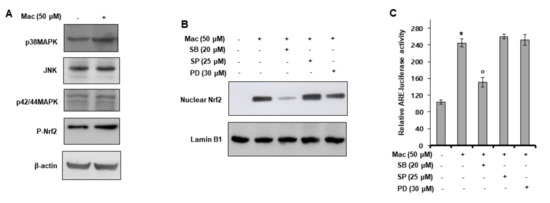 We investigated the mechanism of action of maclurin in Nrf2 signaling. First, we performed a Western blot analysis of MAPKs and Nrf2. As shown in Figure 5A, maclurin induced the phosphorylation of Nrf2 and p38 MAPK, but not JNK and p42/44 MAPK. To examine the involvement of p38 MAPK in the nuclear translocation of Nrf2, we conducted Western blot analysis of the nuclear fraction. While SP600125 (a JNK inhibitor) or PD98059 (a p42/44 MAPK inhibitor) did not affect the maclurin-induced nuclear translocation of Nrf2, SB203580 (a p38 MAPK inhibitor) attenuated the maclurin effect (Figure 5B). Similar results were seen in the ARE-Luc reporter assay (Figure 5C). Namely, while SB203580 attenuated the maclurin-induced ARE activation, SP600125 and PD98059 showed no effect. These results indicate that maclurin activated Nrf2 signaling by activating p38 MAPK.