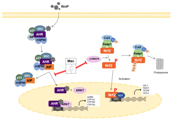 In this study, we demonstrated the antagonizing effects of maclurin against B[a]P in human epidermal keratinocytes. Maclurin inhibited AHR signaling, as evidenced by the suppression XRE reporter activation, CYP1A1 expression, and ROS production induced by B[a]P in HaCaT cells. In addition, maclurin treatment activated Nrf2, as shown by activation ARE reporter and the enhanced expression of ARE-dependent genes. We demonstrated that the antagonist effects of maclurin on B[a]P were mediated by inhibiting AHR through the maintenance of the AHR-AIP complex and activating Nrf2 through p38 MAPK activation.