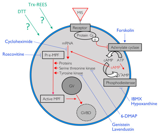 26]. Despite the presence of forskolin, hypoxanthine and IBMX, REES induces oocyte maturation, contrary to DTT. Yet, thioredoxin from