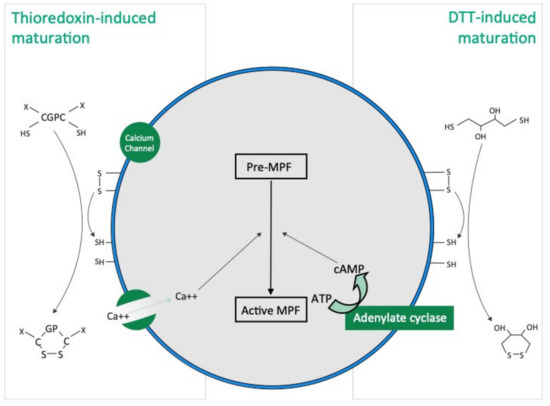 25]. Later, with the use of pharmacological agents, Karaseva and Khotimchenko demonstrated that the reduction induced by DTT at the oocyte surface leads to a decrease in the intracellular cAMP level of