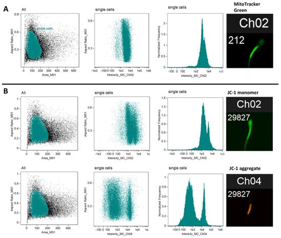 Representative images of flow cytometry data obtained for MitoTracker Green (A) and JC-1 (B). Images from left to right present: dot-plot graphs of the gated region (highlighted in blue) for spermatozoa—area vs. aspect ratio (signals collected in bright field); dot-plot images of signals collected at channels Ch02 (green 532/555 nm) and Ch04 (orange/red 610/630 nm); histograms representing fluorescence intensity obtained for each analysed sample (bull sperm cells); and example fluorescent images acquired for each of the analysed sperm cells.
