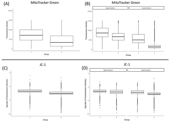 Mitochondrial content and activity in spermatozoa of bulls with high and low sperm quality parameters. (A,C) show the data obtained for the sperm samples not subjected to the swim up procedure, and (B,D) show the data after swim up. All of the observed groups differ significantly (p ≤ 0.01).