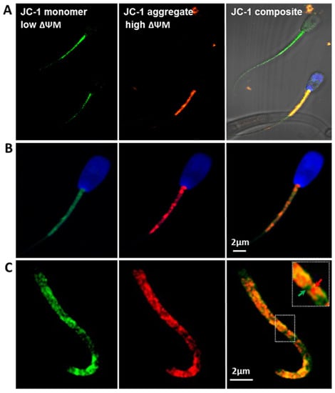 Alternations in mitochondrial membrane fluidity during cryopreservation have been suggested to raise the ΔΨm and induce the release of ROS, which in turn cause single/double-strand DNA breaks [,,]. Changes in osmotic balance may also induce apoptosis [], oxidative stress [], and loss of mitochondrial function []. Short-term openings of the mitochondrial permeability transition pore (mPTP), leading to the release of Ca2+ and ROS, fulfils physiological functions. Prolonged opening causes the collapse of the ΔΨm, ATP loss, osmotic shock, and rupture of an outer mitochondrial membrane (OMM), which eventually leads to necrosis or the release of mitochondrial pro-apoptotic factors [,,]. Thus, ΔΨm may serve as an indicator of mitochondrial activity and functional capabilities of spermatozoa. ΔΨm shows a direct and significant correlation with sperm count, normal morphology, motility, and viability []. Spermatozoa with low ΔΨm are less capable of undergoing the acrosome reaction [,]. Studies by Garner and Thomas [] have indicated that bovine sperm motility positively correlates with the number of cells exhibiting high JC-1 aggregate level. JC-1 dye serves as a mitochondrial potential sensor. It indicates the level of mt-depolarisation by assessing the red/green fluorescence intensity ratio, which reflects the ΔΨm status. Polarised mitochondria are marked by orange–red signals (JC-1 aggregates), which on depolarisation diffuse green monomer fluorescence (Figure 4). In our studies, spermatozoa collected from high AI performance bulls had higher ΔΨm than the cells obtained from bulls with impaired sperm motility and morphology parameters (Figure 3B). Studies in men showed that low sperm motility may be associated with deformations of the mitochondrial sheath containing functional mitochondria. In this case, lower ΔΨm results from the abnormal morphology of the axoneme and causes low sperm motility and severe asthenozoospermia [].