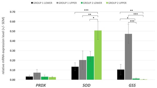 Transcript level of antioxidant enzymes genes crucial for protection against high levels of ROS in spermatozoa. “upper” and “lower” refer to the swim up fractions; statistically significant differences are indicated by *** (p ≤ 0.001), ** (p ≤ 0.01) and * (p ≤ 0.05).