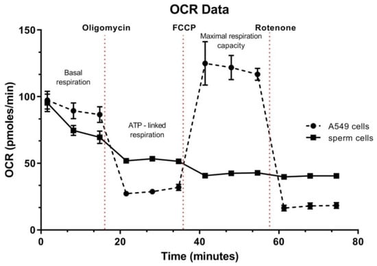 An example result of spermatozoa OCR analysis compared to the control cell line (A549). Mitochondria of the somatic cells present different reactivity to the administered chemicals (FCCP and Rotenone) than the tested sperm cells. Only oligomycin treatment results in a drop of basal respiration in sperm.