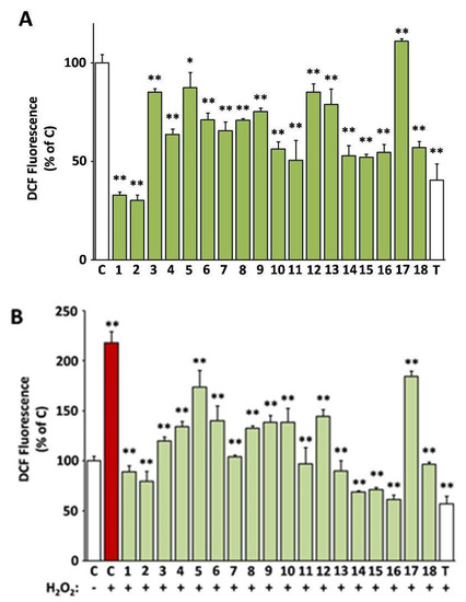 Cells were plated in 96-well clear-bottomed black microplates at a density of 7000 cells/well in serum-containing medium and were left to adhere for 18 h. Then, the test extracts were added diluted in serum-free, phenol-red-free DMEM at the highest non-cytotoxic concentration. After a 24 h incubation, 2′,7′-dichlorodihydrofluorescein diacetate (DCFH-DA; Merck KGaA, Darmstadt, Germany) was added at a final concentration of 10 μM for further 45 min. Then, the medium was replaced by phosphate buffered saline (PBS) or PBS supplemented with 100 μM H2O2, and, following a 15 min incubation, fluorescence emission was determined at 520 nm following excitation at 485 nm in a FLUOstar Optima microplate reader.