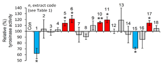 Cell-based anti-melanogenic activity of the extracts. Relative (%) tyrosinase activity in B16-F10 melanocytes treated with the extracts for 24 h. Dimethyl sulfoxide (DMSO)-treated cultures served as controls (con). Bars ± SD (n ≥ 2). * p < 0.05; ** p < 0.01. Control values were set to 100%.