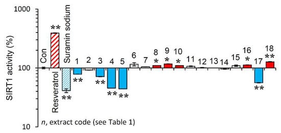 Effect of the plant extracts on Sirtuin 1 enzymatic activity. Relative (%) Sirtuin 1 activity of the extracts. Resveratrol and suramin sodium, a Sirtuin 1 activator and inhibitor, respectively, were used as positive controls. Dimethyl sulfoxide (DMSO) served as control (con). Bars ± SD. (n ≥ 2). * p < 0.05; ** p < 0.01. Control values were set to 100%.