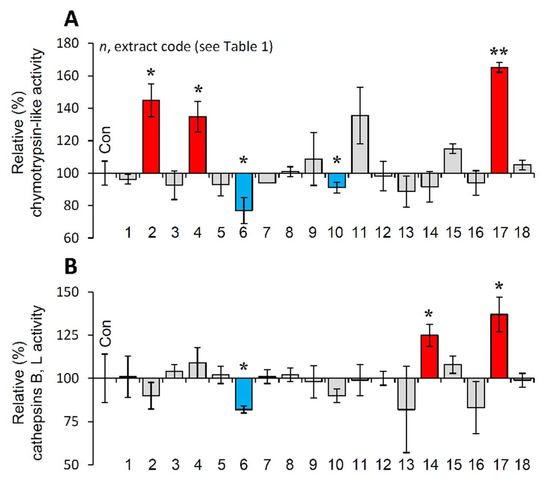 Effect of the extracts on the main proteostatic pathways. (A) Relative (%) chymotrypsin-like (CT-L) activity after incubation of young BJ cells with the extracts for 24 h. (B) Relative (%) cathepsins B, L activity in BJ cells treated with the extracts for 24 h. Dimethyl sulfoxide (DMSO)-treated cultures served as controls (con). Bars ± SD. (n ≥ 2). * p < 0.05; ** p < 0.01. Control values were set to 100%.
