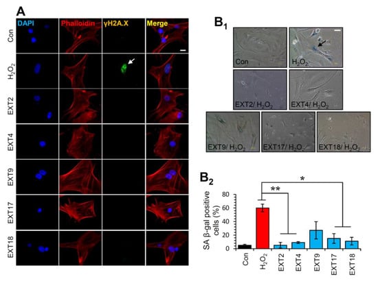 Thereafter, the most promising extracts, i.e., EXT2, EXT4, EXT9, EXT17 and EXT18 were further investigated for any genotoxic impact on BJ cells. To this end, we assessed the phosphorylation of H2A.X on Ser139, which is a marker of DNA damage [36]. As shown in Figure 6A, immunofluorescence data for γH2A.X revealed that treatment of cells with the extracts for 24 h did not cause any DNA damage. The formation of phosphorylated H2A.X foci in the nuclei of the cells was detected in the cells treated with 300 μΜ H2O2 (positive control) for 24 h (Figure 6A).