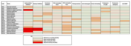 Most of the above results are illustrated collectively in Figure 9, where the heterogeneity of the extracts’ bioactivities is obvious, also reflecting the diversity of their phytochemical content. Although few of the extracts exhibit maximal bioactivities in certain assays, all of them seem to combine considerable activities in many assays. This fact renders all these extracts significant candidates for use in cosmetic products against skin aging.