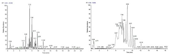 Base peak chromatogram of the S. scardica (left) and R. damascena (right) methanolic extracts, negative ionization mode.