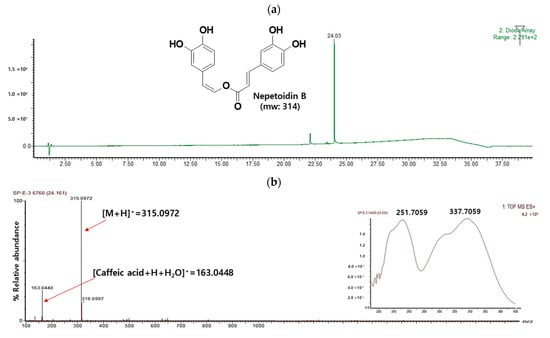 The yellow powder of compound 1 was obtained. Its molecular formula was deduced to be C17H14O6 by HRESIMS, with a molecular ion peak [M]+ seen at m/z 314.0972 (calcd m/z 314.0790) (Figure 1b). It had a fragment ion at m/z 163, which indicated typical caffeic acid esters [13]. In the 1H NMR spectrum, trans-oriented (δ 7.73, 1H, d, J = 16.2 Hz; δ 7.46, 1H, d, J = 16.2 Hz) and cis-oriented (δ 7.23, 1H, d, J = 7.2 Hz; δ 5.63, 1H, d, J = 7.2 Hz) olefinic proton resonances were observed, as well as two sets of protons resonating on the catechol moieties (δ 7.30, 1H, d, J = 2.4 Hz; δ 7.13, 1H, d, J = 1.8 Hz; δ 7.05, 1H, br d, J = 8.4 Hz; δ 6.91, 1H, dd, J = 8.4, 2.4 Hz; δ 6.82, 1H, d, J = 8.4 Hz; δ 6.76, 1H, d, J = 8.4 Hz). In the 13C NMR spectrum, 17 carbons were evident: an ester carbonyl carbon at δ 165.9 ppm; 4 oxygenated sp2 carbons at δ 149.1 ppm (C-3), 150.2 ppm (C-4), 146.1 ppm (C-3′), and 146.1 ppm (C-4′); 1 oxygenated sp2 methine carbon at δ 133.0 ppm (C-8′); 2 sp2 qua-ternary carbons at δ 127.9 ppm (C-1), and 127.9(C-1′); and 10 sp2 methine carbons at δ 147.0 ppm (C-8), 133.0 ppm (C-8′), 122.9 ppm (C-6′), 123.6 ppm (C-6), 117.4 ppm (C-2′), 116.7 ppm (C-5), 116.3 ppm (C-5′), 115.7 ppm (C-2), 113.8 ppm (C-7), and 113.3 ppm (C-7′) (Supplementary Figures S1 and S2, Table S1). The 1H and 13C NMR spectra of compound 1 were compared to those reported in the literature, and compound 1 was identified as NeB. In addition, signals were shown in the UV spectrum at 251 and 337 nm, which is typical for NeB (Figure 1b). NeB has been mainly isolated from Plectranthus forterim, Salvia miltiorrhiza bunge, and Perilla frutescens [13,14,15]. To the best of our knowledge, NeB has not yet been isolated from S. plebeia previously, and this study constitutes the first report of NeB in S. plebeia.