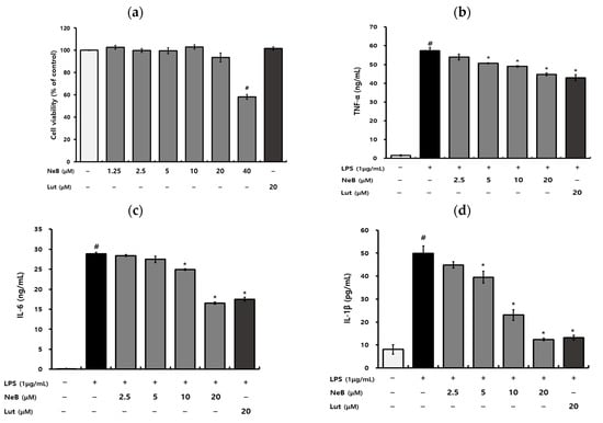 NeB has no effect on cell viability (a) but reduces the release of the pro-inflammatory cytokines TNF-α (b), IL-6 (c), and IL-1β (d) in LPS-stimulated RAW 264.7 cells. # p < 0.05 compared to the untreated control group; * p < 0.05 compared to the LPS-stimulated group. NeB, nepetoidin B; Lut, luteolin (used as a positive control at a concentration of 20 μM).