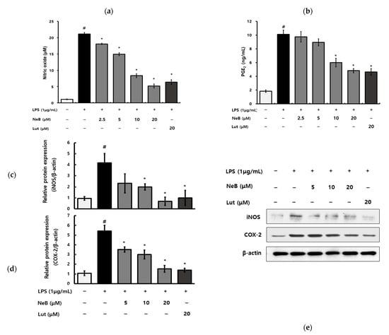 NeB inhibits the generation of NO (a) and PGE2 (b), as well as the protein expression of iNOS (c,e) and COX-2 (d,e), in LPS-stimulated RAW 264.7 cells. # p < 0.05 compared to the untreated control group; * p < 0.05 compared to the LPS-stimulated group. NeB, nepetoidin B; Lut, luteolin (used as a positive control at a concentration of 20 μM).