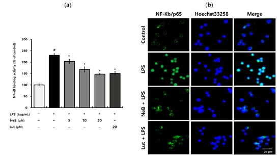 Therefore, we aimed to ascertain whether NeB isolated from S. plebeia pretreatment affects the activation of the NF-κB signaling pathway in LPS-stimulated RAW 264.7 cells. In this study, NF-κB nuclear translocation was examined using immunofluorescence methods. For 1 h, cells were pretreated with NeB and then activated with LPS. The DNA binding activity of p65 increased the response to LPS stimulation, and pretreatment with NeB attenuated this NF-κB binding activity in a dose-dependent manner in cells (Figure 4a). The results were verified by immunofluorescence microscopy of NF-κB nuclear localization. Figure 4b shows that the p65 subunit was translocated into the nucleus following LPS stimulation, and that pretreatment with NeB blocked this response in RAW 264.7 cells. It was evident that NeB inhibited the inflammatory signaling cascade by regulating the phosphorylation of cytoplasmic p50/p65 units, lowering their ability to translocate into the nucleus and thus limiting the inflammatory signaling cascade. A recent study reported that pretreatment with NeB reduced the NF-κB pathway mainly by affecting nuclear translocation of IKKα/β and NF-κB/p65 [14]. In addition, NeB partially reversed the LPS-induced increases in nuclear p65 and decreased in cytoplasmic IκBα [14].