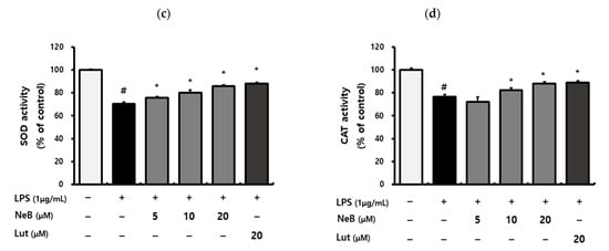 Cells (1 × 106 cells/well) in a 6-well plate were pre-incubated with and without the indicated doses of NeB for 1 h and then stimulated with LPS (1 μg/mL) for 24 h. The medium was removed, and the cells were harvested with lysis buffer (0.1 M Tris-HCl [pH 7.4], 0.5% Triton X-100, 5 mM β-mercaptoethanol, and 0.1 mg/mL phenylmethanesulfonyl fluoride). Then, the cells were centrifuged at 14,000× g for 5 min at 4 °C. The supernatants were used for assessing antioxidant enzyme activities. Superoxide dismutase (SOD) and catalase activity were quantified using commercial assay kits from BioVision Inc. (Milpitas, MA, USA), following the manufacturer’s instructions.