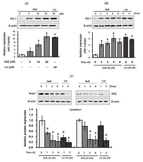 To further investigate this mechanism, we ascertained the protein levels of Nrf2, a crucial regulator of HO-1 activation. In the cytosol, Nrf2 is sequestered by Keap1 and constitutively targeted for poly-ubiquitination under basal conditions [26]. However, certain stimuli trigger Nrf2 to be released from Keap1, facilitating Nrf2 to translocate into the nucleus and activate HO-1 [30]. Nrf2 is generally coupled with the Keap1 protein and phase II enzyme under normal conditions. HO-1 activation only occurs when Nrf2 is released and translocated to the nucleus [26]. Therefore, we analyzed the protein levels of Nrf2 in the nucleus and cytoplasm to elucidate the mechanism behind NeB-mediated Nrf2 activation. Nrf2 protein levels were influenced by NeB treatment (Figure 6c,d). Under normal conditions, the content of nuclear Nrf2 was significantly increased following NeB treatment, as expected (Figure 6d). In particular, after 6 h, NeB treatment increased Nrf2 nuclear translocation while lowering cytosolic Nrf2 levels. Based on these findings, we inferred that NeB would promote the dissociation of Nrf2 and Keap1, allowing Nrf2 to translocate to the nucleus. Therefore, we suggest that the interaction of NeB with the Nrf2-Keap1 complex may cause HO-1 to be released.