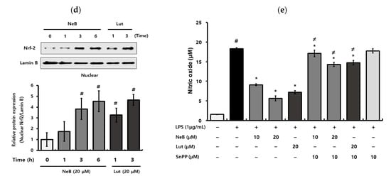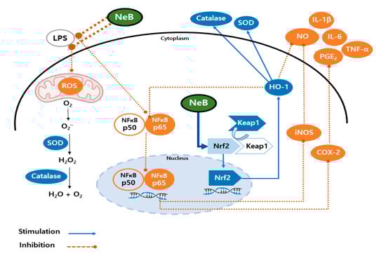 To confirm that NeB inhibits pro-inflammatory mediators such as NO through HO-1, cells were treated with a particular HO-1 inhibitor (SnPP) before NeB treatment. NO production stimulated by LPS was not affected by the addition of SnPP, and inhibition of NO production by NeB was significantly reduced due to the HO-1 inhibitor (Figure 6e). These findings suggest that the antioxidant and anti-inflammatory properties of NeB are associated with activated HO-1, as well as antioxidant enzymes.