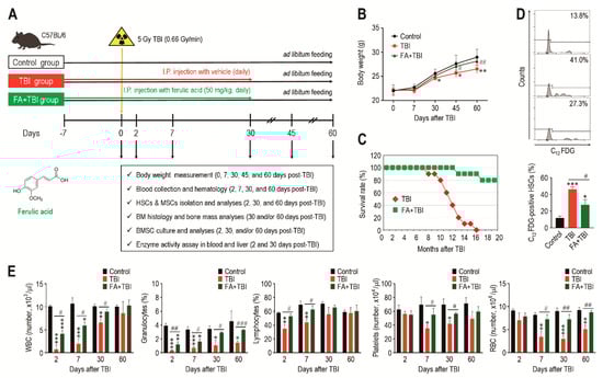 We previously found that, in addition to ferulic acid, dietary antioxidants, caffeic acid and coumaric acid prevent TBI-mediated damages of liver and spleen tissues and HSC senescence, as well as restore activities of endogenous antioxidant enzymes []. Caffeic acid also exhibited an autonomous ameliorating effect on HSC-senescence-associated long-term BM injury and mortality in TBI mice, and induced in vitro anticancer activity, thereby indicating its clinical usefulness as a supplemental drug for cancer patients []. Different to the previous studies [,], this study administered mice with ferulic acid via intraperitoneal injection once per day for 37 consecutive days (7 days before and 30 days after TBI), and TBI-associated phenotypes in mice were analyzed at various time points after TBI. These experimental approaches allow the impacts of radioprotective antioxidant on TBI-mediated systemic damages to be defined in regard to its long-term administration, as well as to evaluate a time-dependent alteration of TBI-associated characteristic phenotypes. Our results support that intraperitoneal injection of ferulic acid inhibits TBI-mediated HSC senescence and acute reduction of circulating blood cells. As TBI-mediated defects in hematopoietic development may increase the risk of bleeding, infection, and mortality, our findings also indicate that long-term administration of ferulic acid protects mice against TBI-mediated mortality by restoring levels of circulating blood cells.