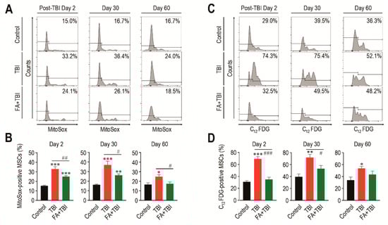 Supplemental ferulic acid inhibits TBI-mediated increases of ROS accumulation and senescence induction in BM-conserved MSCs. (A,B) Level of mitochondrial superoxide anions in BM MSCs from mice groups were assessed by flow cytometry using MitoSoxTM Red reagent at the indicated days after TBI (n = 4). (C,D) SA-β-gal activity in BM-conserved MSCs from mice groups was also measured by flow cytometry using C12FDG at the same post-TBI days (n = 4). All data are presented as the mean ± SD. * p < 0.05, ** p < 0.01, and *** p < 0.001 compared with control group; # p < 0.05, ## p < 0.01, and ### p < 0.001 compared with TBI group.