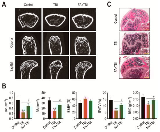 The BM microenvironment provides niches for retention and self-renewal of BM HSCs and MSCs, and its impairment is related to abnormal retention and senescence of these cells, along with bone mass loss []. We explored whether the TBI-induced stem cell senescence and body weight loss is associated with impaired BM microenvironments. The 2D μCT analysis 60 days after TBI showed greater bone mass in control and FA+TBI groups compared with the TBI group (Figure 3A). When values of bone parameters were evaluated, the TBI group revealed significantly lower values of BV (p < 0.01), BS (p < 0.01), BV/TV (p < 0.01), and BMD (p < 0.05) compared with the control group (Figure 3B). TBI-induced decreases in the bone values were restored in mice supplemented with ferulic acid up to the levels of control mice. Ferulic-acid-induced protection on TBI-mediated bone loss was supported by H&E staining, in which the TBI group showed relatively lower bone mass in the trabecular region at 60 days post-TBI than the control or FA+TBI group (Figure 3C).