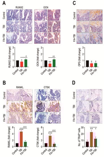 Femurs were isolated from mice 30 and 60 days after TBI and fixed with a 4% paraformaldehyde solution for 48 h, followed by decalcification in 10% EDTA at 4 °C for 4 weeks. The tissue, including the trabecular region, was dehydrated in series of alcohol, embedded in paraffin, and sectioned into 5.0 µm in thickness. For hematoxylin and eosin (H & E) staining, tissue sections were treated with hematoxylin solution (Gill No. 3) before counterstaining with 0.25% eosin Y Stain (bioWORLD Life Sciences, Dublin, OH, USA). Parts of tissue sections were subjected to tartrate-resistant acid phosphatase (TRAP) staining using a leukocyte acid phosphatase kit (Cosmo Bio, Tokyo, Japan), followed by counterstaining with hematoxylin. The levels of osteoprotegerin (OPG; BS1862, Bioworld Technology, St. Louis Park, MN, USA), receptor activator of nuclear factor κB ligand (RANKL; ALX-804-243, Enzo Life Sciences, Inc., Farmingdale, NY, USA), osteocalcin (OCN; AB10911, Millipore corporation, Temecula, CA, YSA), runt-related transcription factor 2 (RUNX2; BS2831), cathepsin K (CTSK; SC-48353, Santa Cruz Biotechnology, Inc., Dallas, TX, USA), nuclear factor erythroid 2-related factor 2 (NRF2; BS1258), and adiponectin (ab22554, Abcam) were evaluated by immunohistochemistry (IHC). In IHC assay, tissue sections were stained with each primary antibody (1:200–400 dilutions) specific to the factors, and the expression patterns were determined using rabbit-anti- or mouse-anti-Vectastain ABC DAB-HRP kits (Vector Laboratories, Burlingame, CA, USA). All procedures for TRAP and IHC staining followed the manufacturer’s instructions, and the stained sections were observed under a light microscope (EL-Einsatz 451888, Carl Zeiss, Ostalbkreis, Germany).